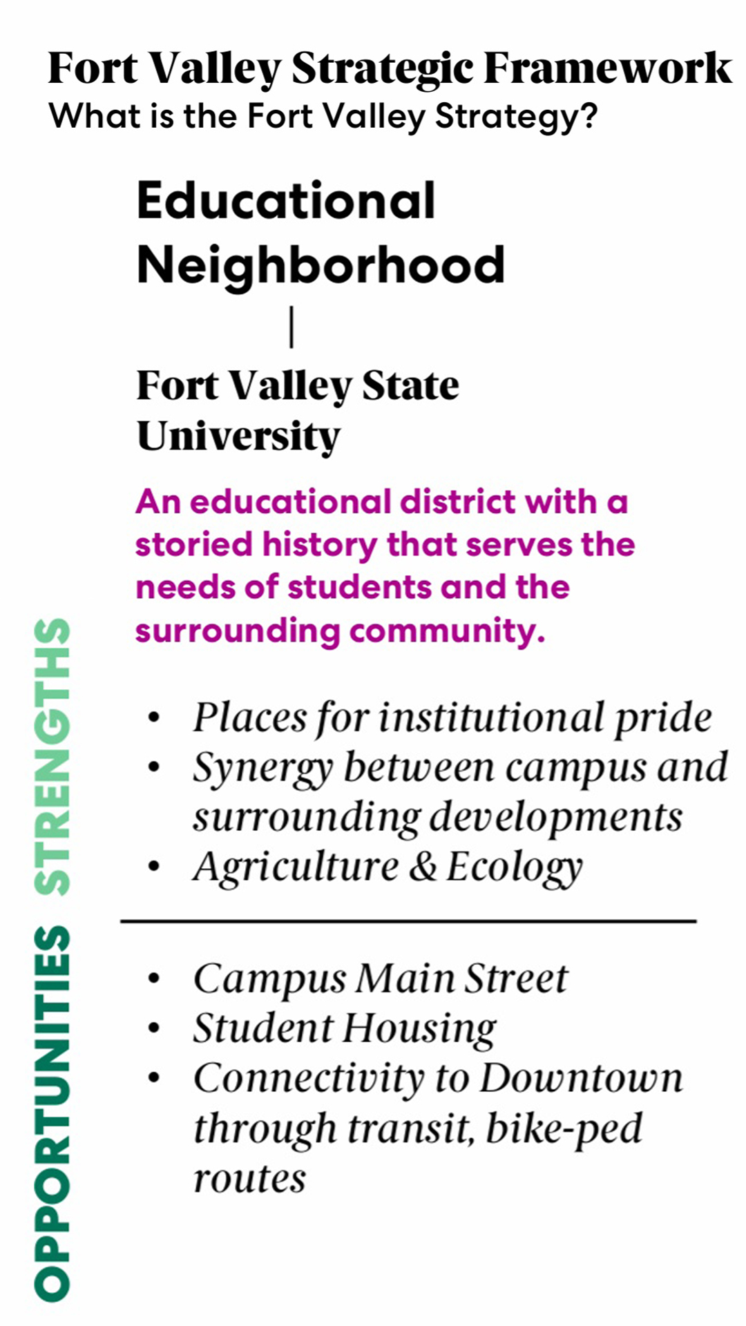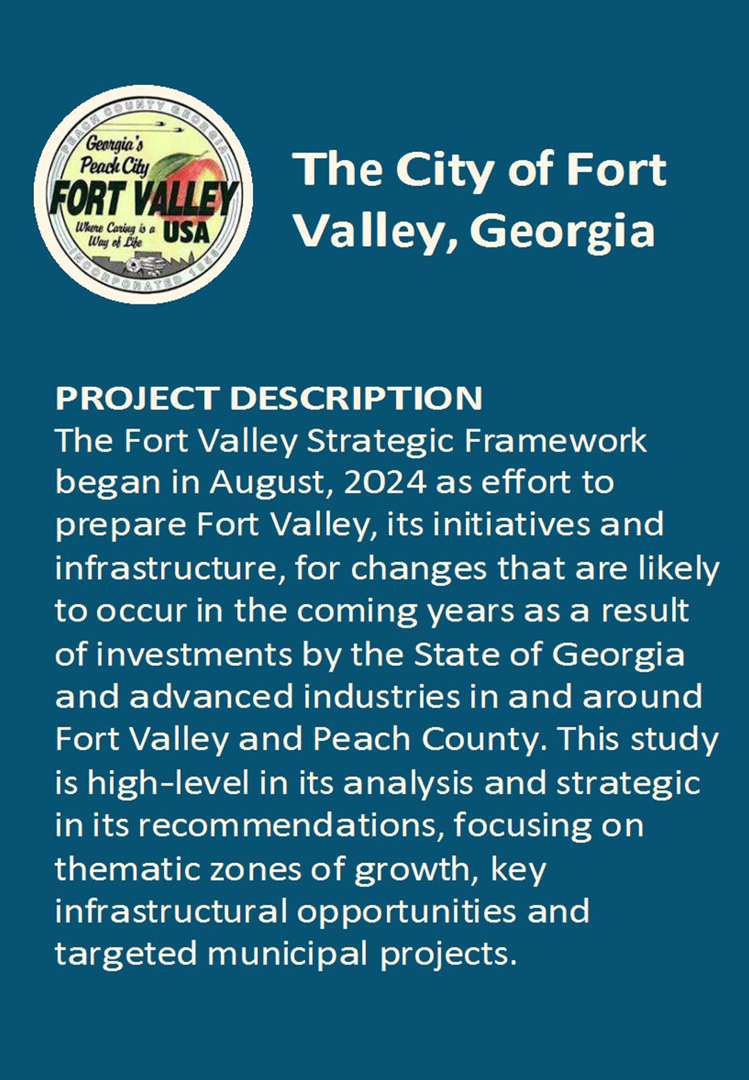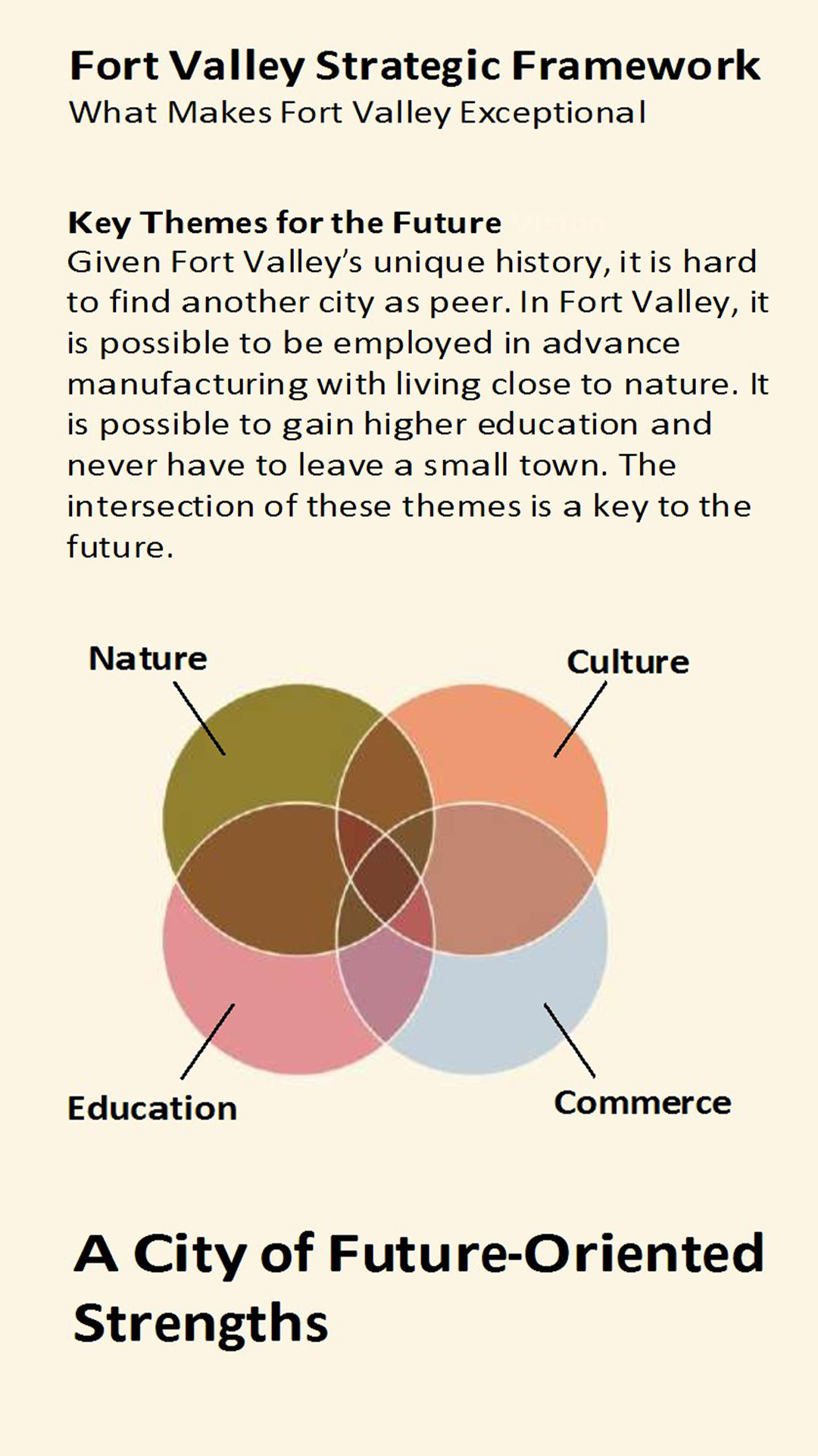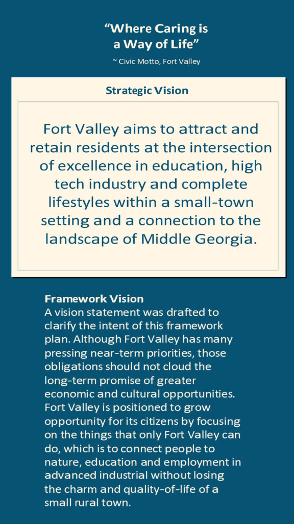 Fort Valley is positioned to expand opportunity for its citizens by focusing on the things that only Fort Valley can do: to connect people to nature, education and employment in advanced industry without losing the charm and quality-of-life of a small rural town.