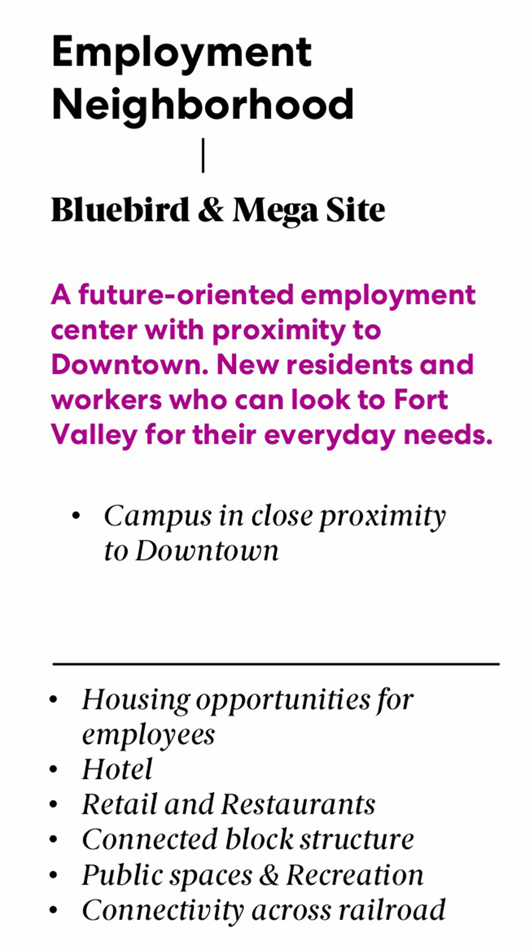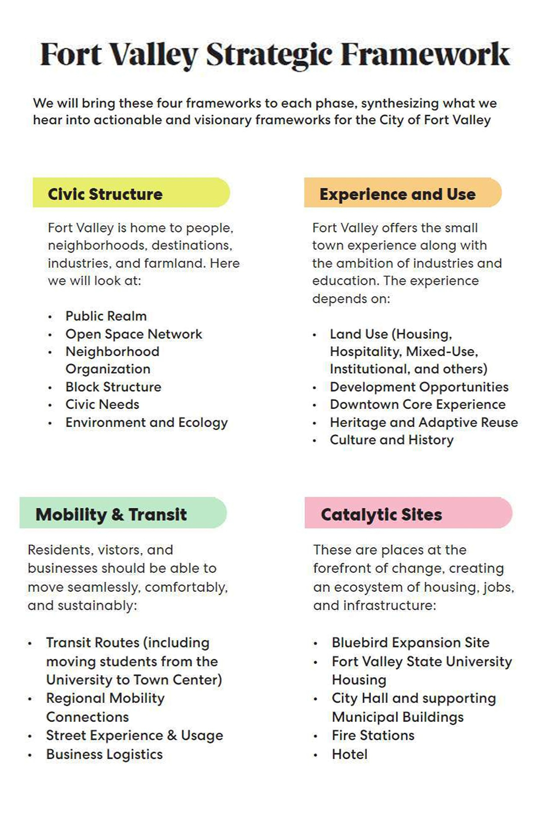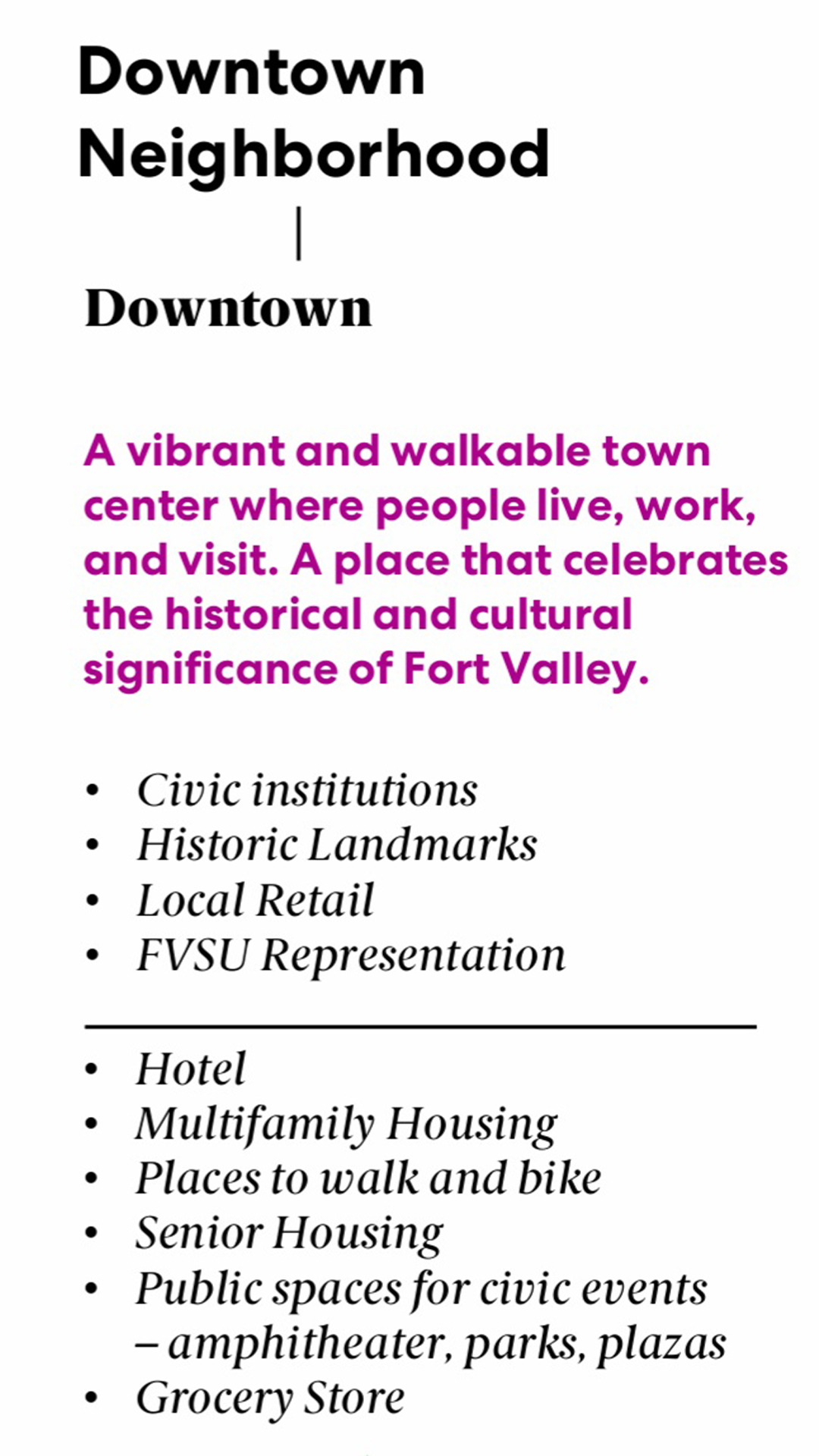 A vibrant and walkable town center where people live, work, and visit. A place that celebrates the historical and cultural significance of Fort Valley.